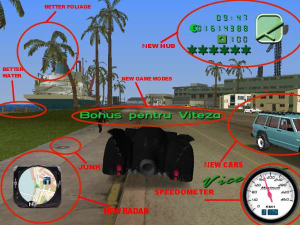 - 512*512 player textures - 11 in game skins (Artic Avenger, Yamaha biker, Gordon Freeman, HL2 Cop, FPS skin, Tommy D'Angelo, Leather suit, Astyle Casual, Flanco worker, Main Player Skin, Rocker Skin ) + 22 editable external *.BMP skins - Speed Bonus (+100$/sec for speeds over 70mph) - Burn Proof & Unlimited Run from the start - New missions, new sidequests (phone missions, football, over 40 races); - Optional: Gas Station Mode (you'll need to refuel!) - Mission selector & usable phone! - New Weapons ( all weapons have been remodelled and remaped!) - New Cars (Bat Mobil, Lada Tunned, Skyline Tunned, New Maverick, RX7, Supra Tunned, etc...) - New Pedestrians (HL2 characters- police, army, alyx ; new gangs on the street - rockers, manelisti,FBI, etc... ) - New City ( looks like Lost Heaven but with a little more); - Hidden Cars Salesmen - +100 armour, +100 HP (up to 200) secret powerups - fighter planes, invulnerable machine, crazy airline pilots - better particle system (better rain, realistic fire + blur effect, realistic flamethrower + gas effect, water reflections, realistic bulets, realistic explosions & gunfire, matrix bullet trails, realistic blood stains, etc...) - better uninteractable enviroment: space shuttle, redrawn planes, redesigned Malibu, redesigned Ocean View, |